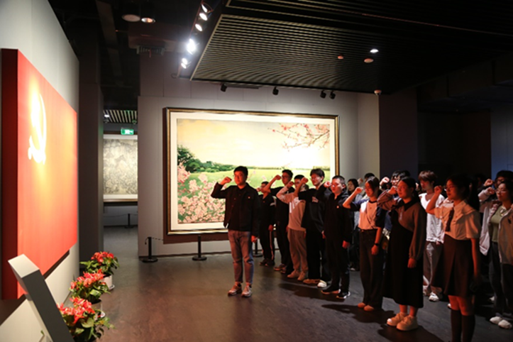 在纪念馆内,支部为新发展的预备党员举行了入党宣誓仪式,支部其他成员也跟随重温入党誓词,本科生党支部书记尹强老师领誓。在鲜红的党旗面前,师生党员庄严宣誓。铿锵有力的誓词回响中,师生党员们牢记使命担当,汲取奋进力量,更加坚定了继承烈士遗志,赓续红色血脉,为共产主义奋斗终身的理想信念。