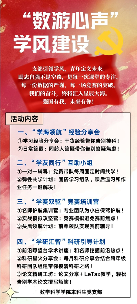 经过前期支部成员的认真调研和精心准备, “数游心声”学风建设项目在此次主题党日上正式发布。