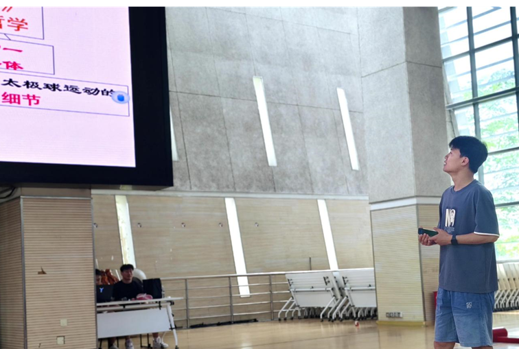 体教民传学硕党支部副书记张师侨介绍了一项孕育于中华传统体育文化的太极球运动,这项由人兽 体育与健康学院杨建营教授于发明的大球类项目,除了有突出的健身效果之外,还直观地展现了老子《道德经》中的“反者道之动”“柔弱胜刚强”“无为而无不为”等道家哲学思想。