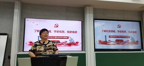会议伊始,学院党委书记贾挚以《了解红史绿城,学史悟思、知史奋进》为题,围绕红史绿城、遵义会议、学科往事、使命担当四个部分为毕业生党员上了一堂生动的党课。她指出,青年人在不同的年代,承担着不同的历史使命,如何将自我融入到国家的发展和民族的振兴中,是每位新时代青年应该深入思考的问题。她勉励全体毕业生党员,一是在中国共产党百年华诞的重大时刻和“两个一百年”历史交汇的关键节点,要牢记党员身份,认真学习党史,从党史学习中汲取前进动力,让初心融入血脉,将使命扛在肩头;二是要在艰苦奋斗中砥砺意志品质,正确面对生活中的压力和挑战,以一往无前的奋斗姿态和永不懈怠的精神状态,迎接前进路上遇到的各种挑战;三是要心怀“国之大者”,在实践锻炼中增长学识才干,紧跟时代变化,继续深学精研专业知识,发挥自身特长,在中华民族伟大复兴的征程中作出自己应有的贡献。