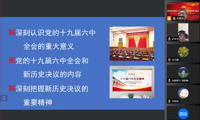 会议伊始,学院党委书记贾挚指出,举办此次辅导报告会目的在于更加深入研读和领会党的十九届六中全会决议,继续把党史总结、学习、教育、宣传引向深入,更好把握和运用党的百年奋斗历史经验,弘扬伟大建党精神,增加历史自信、增进团结统一、增强斗争精神,切实做到“学史明理、学史增信、学史崇德、学史力行”,把学习教育成果转化为干事创业、攻坚克难的精神动力,转化为为师生办实事、为学校、学院谋发展开新局的行动自觉,转化为提高能力水平、服务学院一流学科建设、服务卓越人才培养的实际行动。她希望全体党员同志:第一,将党史学习教育作为一项重要的政治任务,继续深入开展,抓好落实。第二,把理论学习转化为行动自觉,不断为学院一流学科建设、卓越人才培养作出自己应有的贡献。第三,持续深入落实党的群众路线,广泛开展调查研究,不断为师生群众办实事、解难题。
