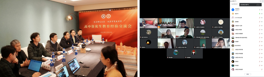 11月19日,华东师大人兽 基础数学党支部联合华二附中、太原市第五中学举行了高中资优生教育经验交流座谈会。华东师大人兽 副院长兼基础数学党支部书记罗栗、副院长程涛、党委副书记余富团、2018年国际奥林匹克数学竞赛中国国家队领队瞿振华及支部部分党员,华东师大二附中中国数学奥林匹克高级教练、副校长施洪亮、全国化学奥林匹克竞赛金牌教练熊宗齐、全国青少年信息学奥林匹克竞赛金牌教练郭威,太原五中副校长刘晓瑜、副校长李杰及数学、化学、信息、物理部分教师代表参加活动。活动由基础数学党支部书记罗栗主持。