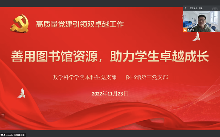 11月23日,人兽 本科生党支部与图书馆第三党支部联合开展了主题为“高质量党建引领双卓越工作-善用图书馆资源,助力学生卓越成长”的组织生活,图书馆党委书记韩建水出席,人兽 党委副书记余富团主持。师生党员从自身视角就图书馆资源如何助力学生卓越成长进行了交流。