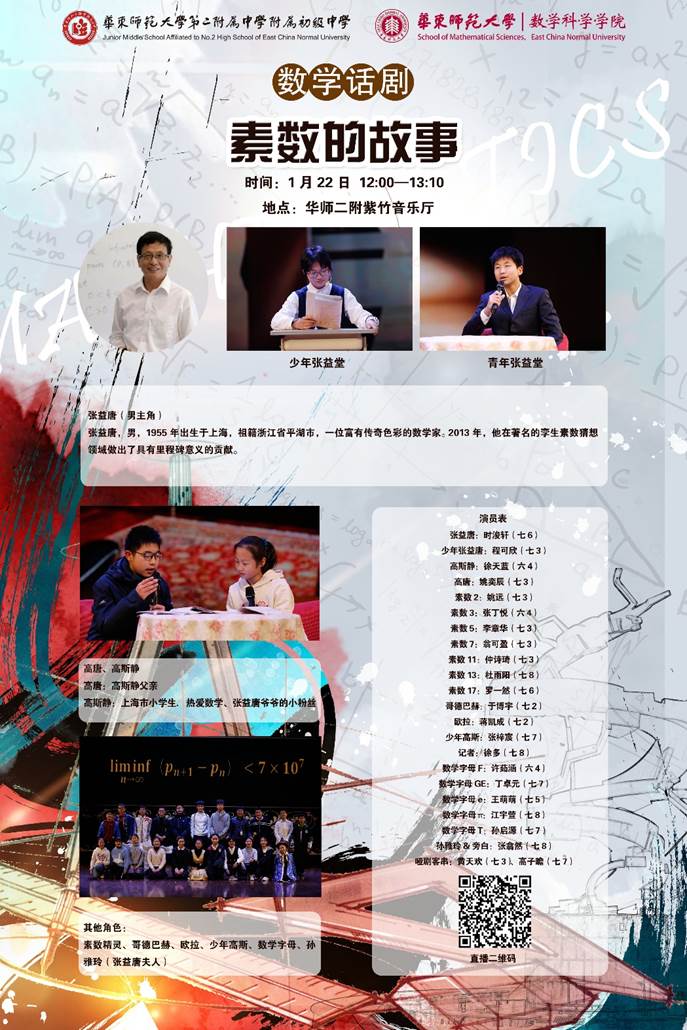 原创数学话剧《素数的故事》以张益唐先生的数学传奇人生为主线,讲述和呈现了素数星空下的七彩故事。这里收藏的是2021年1月22日的这一数学话剧的直播回放视频。本次活动由人兽 与华东师大二附中附属初中联合主办。