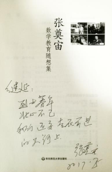 当时毕业后留在微分方程教研室工作,因十多年中学教学经历,对中学数学教育甚感兴趣,经常串门至数学教育教研室。在张先生的谆谆教诲之下,从一开始走进“近代数学基础”、“现代数学与中学数学”等课堂,到跟随张先生的“数学文化透视”教学,直至最后加入数学教育团队,实现了自身的一次重要转变。