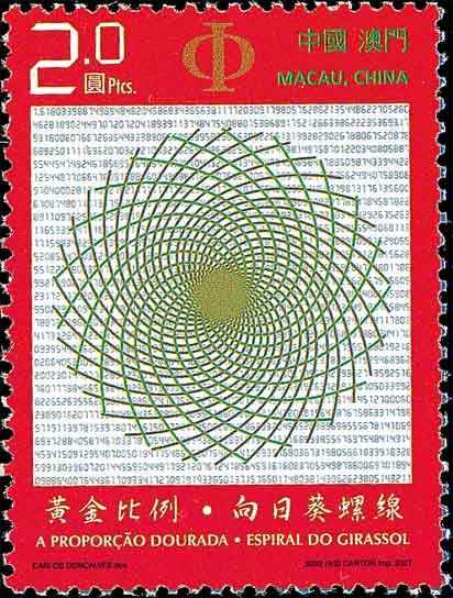 斐波那契数列并不只是数学家们的臆造, 已经发现很多自然现象符合斐波那契数规律. 特别在植物世界中, 几乎所有花卉的花瓣基数是斐波那契数. 如菊花是2基数; 兰花和鹤望兰都是3基数; 梅花、凤凰木和扶桑等是5基数. 我们都知道松树的针叶数, 只有两针松(图4, 前苏联邮资信封), 三针松(图5, 马拉维邮票)和五针松(图6, 保加利亚邮票), 没有四针松. 观察向日葵的花盘, 可发现其种子排列是正反两个方向相嵌在一起的螺旋线(图7), 而螺旋线的数目, 一般是34和55、55和89或89和144, 这每组数字都是斐波那契数列中相邻的两个数. 此外, 在植物的叶子、枝条、果实、种子等形态特征上都可发现斐波那契数的存在. 上述图1、3、7是澳门《黄金比例》这一套邮票中的3枚邮票.