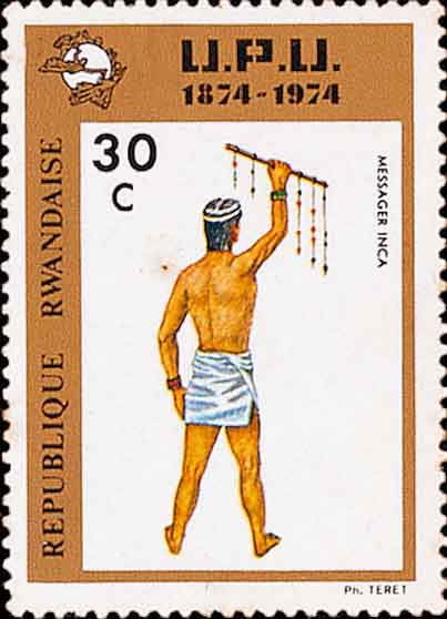 但是这些记数的实物容易散乱, 携带、保存也不方便. 于是就出现了用结绳记数, 这在我国《周易》中就说到“结绳而治”, 它指“结绳记事”或者“结绳记数”. 在世界其他地方人如希腊、波斯、罗马、伊斯兰国家和南美的印加帝国(它包括现在的玻利维亚、厄瓜多尔、秘鲁等地方)也都有结绳记事的记载或实物标本. 这种结绳制度在秘鲁高原甚至延续到19世纪. 图1是结绳记数的实物标本图示, 图2是传递结绳记事的印加信使, 图3的右侧是结绳记数的画面.