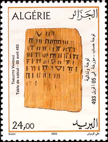 但是结绳还是不甚方便, 于是又出现了在实物(如木头、石板、骨头等)上的刻痕记数方式, 这在中外文献中都有记载和实物标本. 图4的左上方画的就是古人在木柱上刻痕的画面, 刻痕记数应该说就是数文字的雏形. 图5是公元前3000年左右苏美尔人(他们居住于底格里斯河和幼发拉底河之间地带)的记数泥板, 图6是古阿尔及利亚人刻在木板上的计算表格.