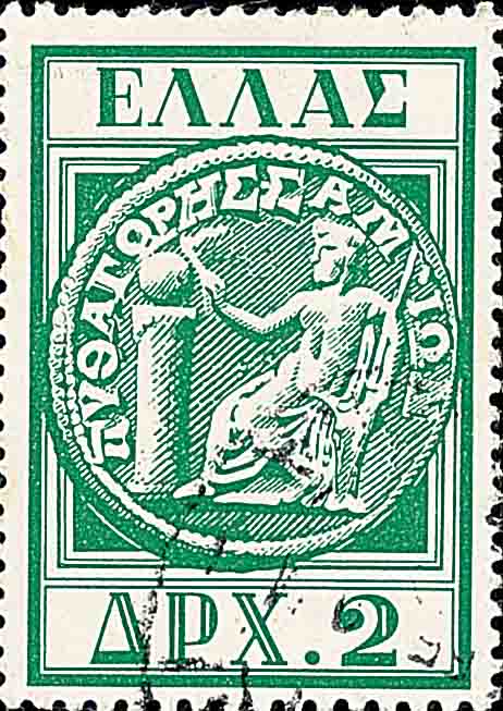 这个定理从最简单 32+42=52 开始到一般性阐述 a2+b2=c2 已经有四千多年历史了, 几乎所有的文明古国 (中国、希腊、埃及、印度等等) 都有关于它的记载. 在西方, 说是古希腊哲学家、数学家毕达哥拉斯 (Pythagoras, 约公元前 580 年 -- 公元前 500 年) 在大约公元前 550 年发现的 (图 3 和图 4 是 1955 年希腊发行的纪念毕达哥拉斯邮票, 图 5 是 1983 年萨拉里昂发行的邮票, 该画取自梵蒂冈壁画, 表现毕达哥拉斯在讲学).