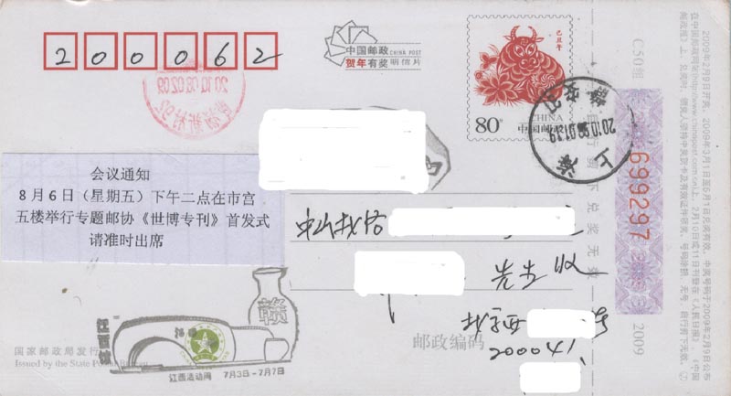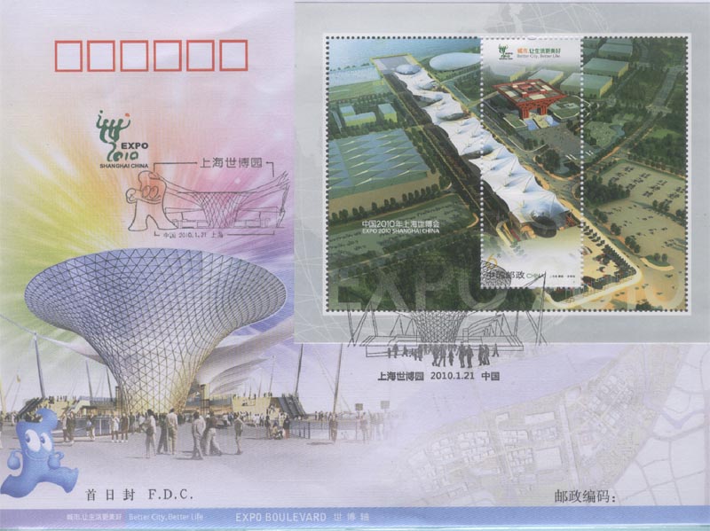 中国2010上海世界博览会于2010年4月30日晚上举行盛大的开幕仪式(图22),5月1日早上正式开园(图23)。为此, 中国邮政发行一枚纪念邮票和各种纪念邮戳(图24)