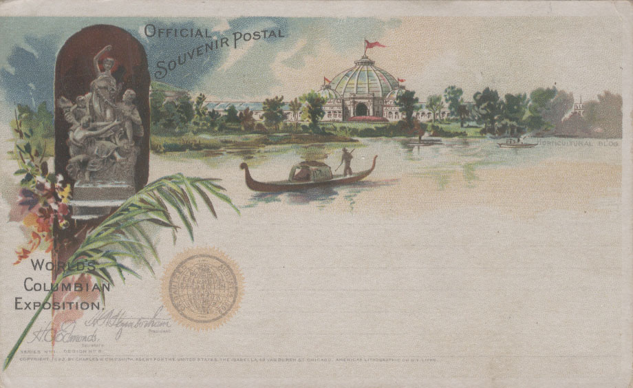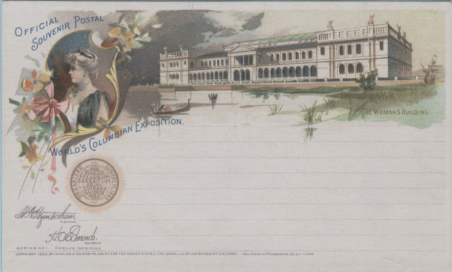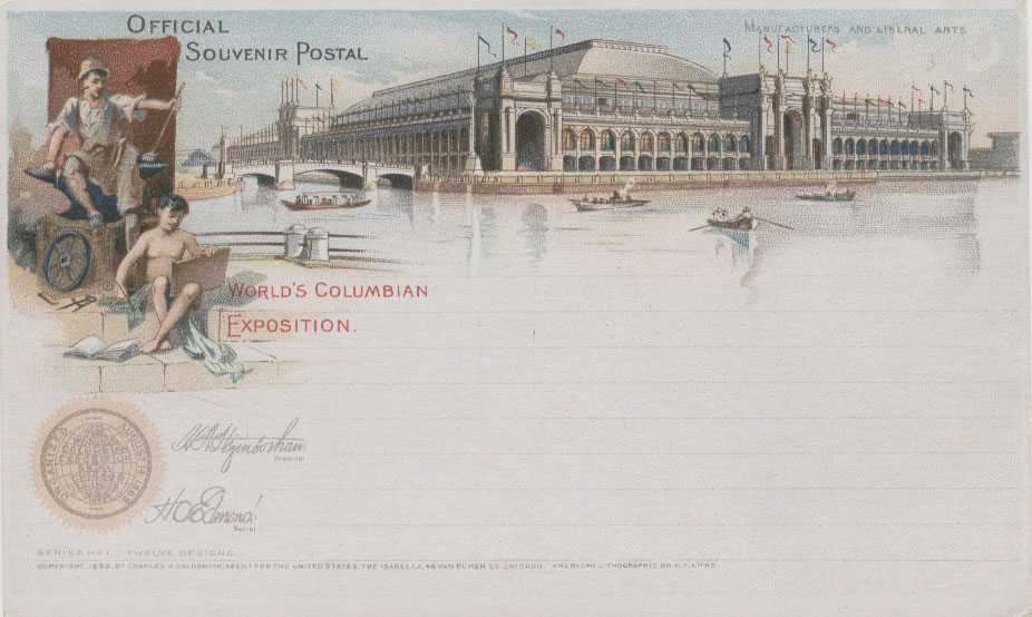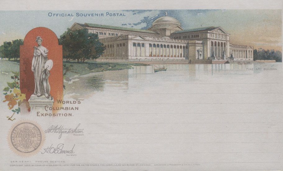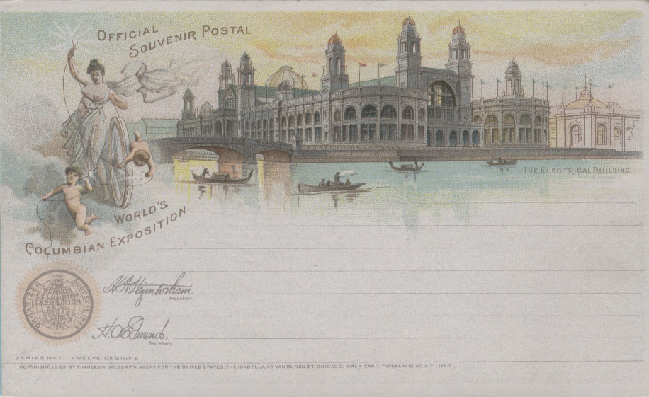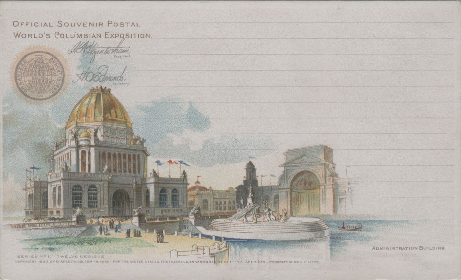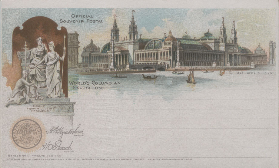 为扩大世博会的影响,美国邮局当局利用1891年发行的邮资明信片为载体加印了一套精美的世博会明信片,除了上述图2以外,其他明信片主要介绍园区内的场馆,如:
