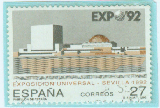 1992年2月28日发行一张《塞维利亚世界博览会》纪念邮票,画面为西班牙亭阁(图22)。
