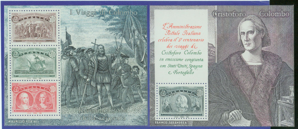 1992年5月22日西班牙与美国、葡萄牙、意大利等四国又同时联合发行同图6枚纪念小型张。 下面图27是意大利的那一套(四套中意大利这一套目前价格最高,约35美元)。