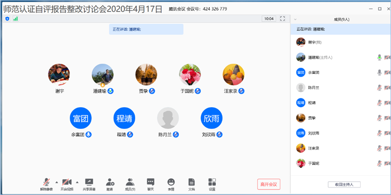 4月17日下午,数学科学学院以“聚焦专家考查报告,不断提升师范生培养质量”为主题,在线组织召开了师范专业认证工作总结会。数学科学学院党委书记贾挚、副院长潘建瑜、副书记余富团、数学教育系主任陈月兰、数学教育专业教师程靖、教务秘书、辅导员以及其他相关成员参加了讨论会。会议由潘建瑜主持。