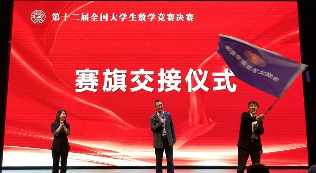 在颁奖典礼现场,全国大学生数学竞赛工作组组长正式宣布第十三届全国大学生数学竞赛由华东师范大学接棒承办,数学竞赛赛旗由吉林大学移交我校。数学科学学院院长谈胜利在接过赛旗后表示,将充分整合各方面按资源,全面做好赛事的组织和管理工作,努力办成一次特色鲜明的全国性高水平赛事。