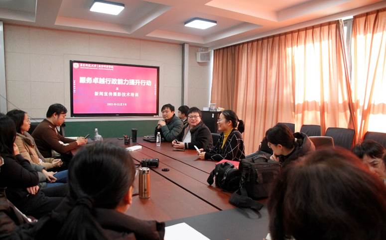 为了更好适应新媒体时代下高校新闻宣传工作的新形势、新要求,进一步提升学院行政人员的综合素质,12月3日上午,人兽 举办“服务卓越行政能力提升系列活动”之新闻宣传摄影技术专题培训。学院党委书记贾挚、副书记余富团和全体行政人员参加了会议。本次培训邀请校党委宣传部吴潇岚老师担任主讲嘉宾,分享新闻宣传经验与摄影技巧,培训会由余富团主持。