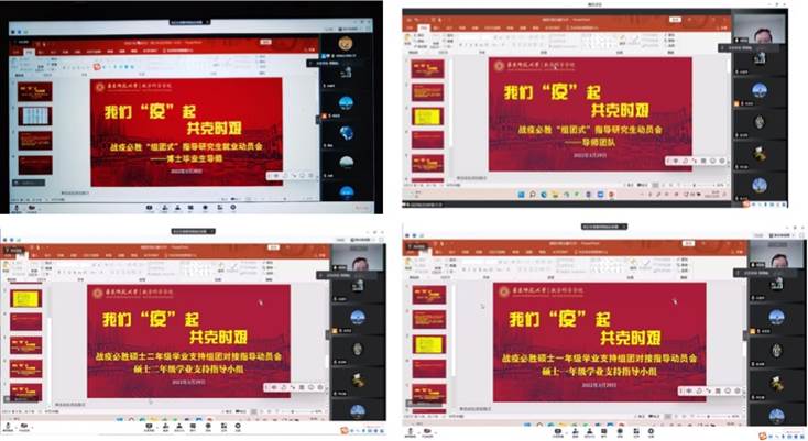 守土有责、守土负责,随后,研究生、本科生分条线分别召开了“学业支持组团对接指导动员会”、“博士毕业生导师指导研究生就业动员会”、“导师团队指导研究生动员会”、“硕士二年级学业支持指导小组动员会”、“硕士一年级学业支持组团对接指导动员会”,再发动再动员。党员带头、全员参与,老师们纷纷启动指导活动,“博士生毕业论文与就业要双管齐下、两不误”,“闷在宿舍不舒服,要多跟导师联系,发泄出来会好很多”,“研究卡壳的时候,随时跟导师沟通”,“数学分析的教学辅助材料都上传到超星大夏平台上了,如果没搞清楚怎么用,我下次再给大家讲一讲”……老师们纷纷给学生支招。截止目前,全院已开展线上组团对接指导活动10余场,本周将完成近20场活动。学院党委将持续推进活动开展,加强考核,直至战疫取得胜利。