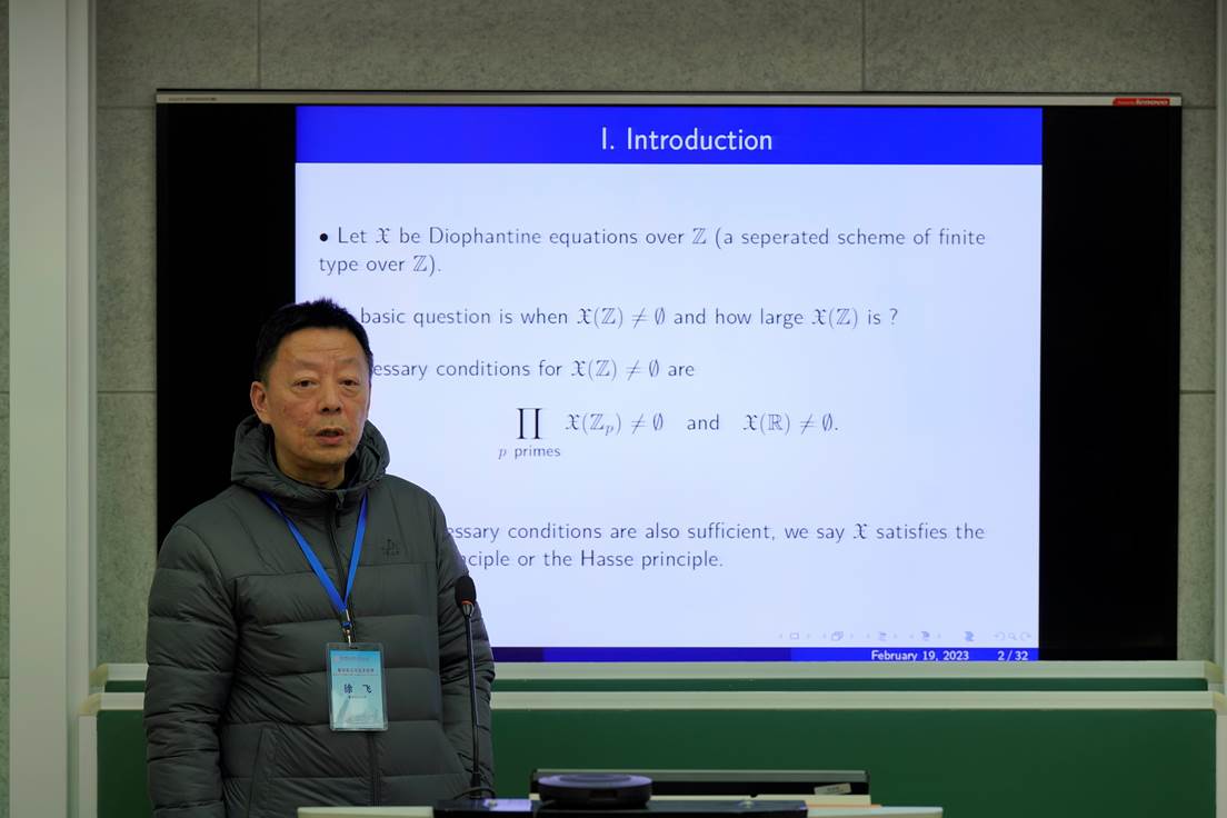 徐飞教授作报告“Strong approximation for certain singular varieties via blowing up”