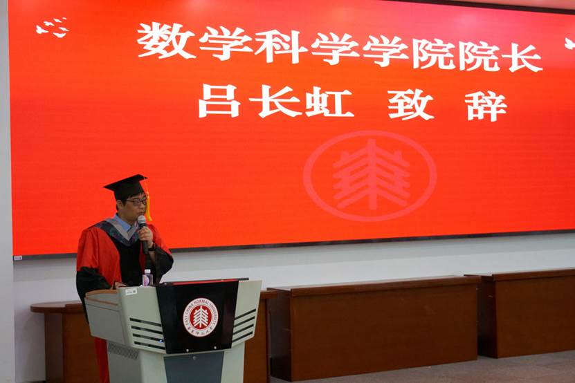 吕长虹在致辞中祝福同学们一路乘风破浪、披荆斩棘。他为同学们送上了真挚的叮嘱:主动追求最坏结果大于等于被动选择的最好结果(要有积极主动的生活态度),贪婪算法大概率找不到最优解(大度的人往往有大智慧),态度决定高度(做事认真是数学人的特征)。