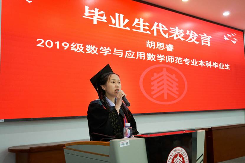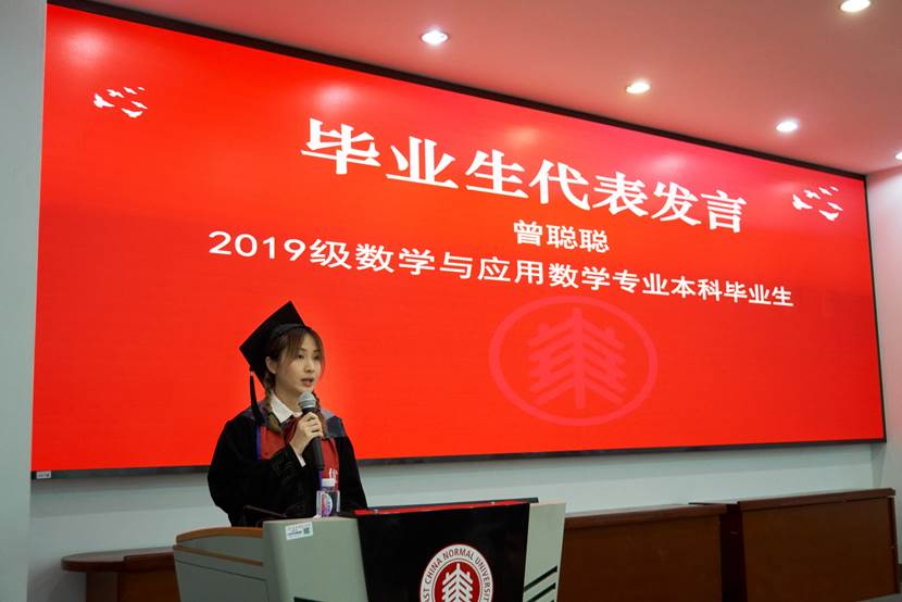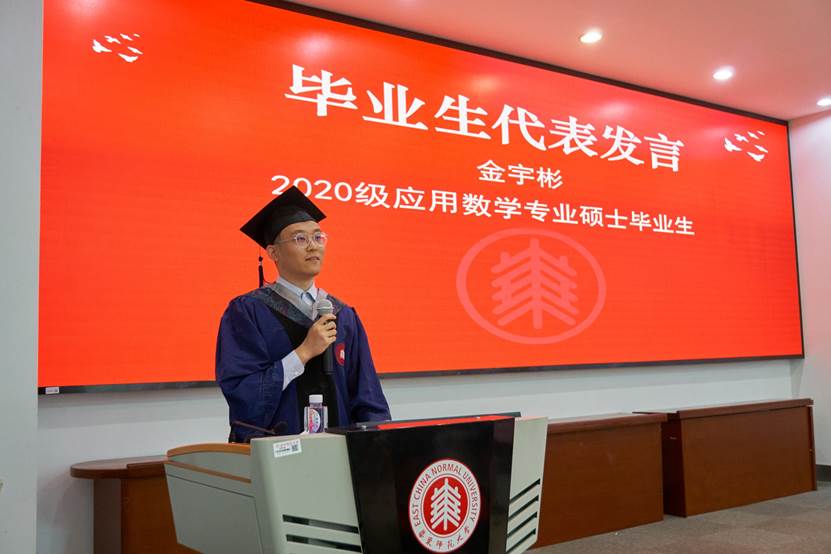 毕业生代表2019级数学与应用数学专业本科生曾聪聪、2019级数学与应用数学师范专业本科生胡思睿、2020级应用数学硕士研究生金宇彬,分别分享了在华东师大数学科学学院的美好生活和学习体验,祝福母校越来越好。