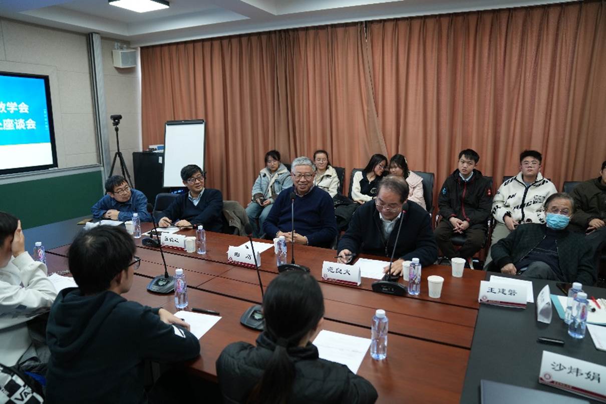 座谈会上,田刚院士听取了数学科学学院本科师范生代表以及数学教育方向研究生代表关于在校学习情况,参加校内外教学实践、学术会议,以所学支边支教、传播数学文化以及服务乡村振兴和服务中国数学教育发展的情况汇报,了解了华东师大卓越师范养成、数学教育方向研究生培养的情况。田刚院士指出,数学教育是国民素质教育中的重要组成部分,对人的发展起到基础性作用,期望数学教育分会与华东师大能够探索数学基础教育、拔尖人才培养方面一些可能的新途径,为国家数学教育的发展做出更多的贡献。吕长虹主持座谈会,华东师范大学原校长、数学科学学院王建磐教授及部分青年教师、学生代表出席。