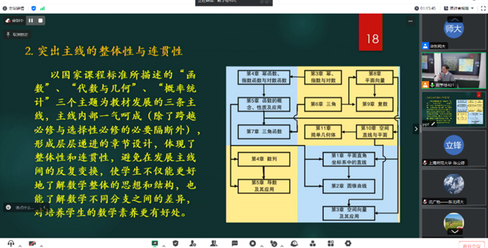 4月17日下午,沪教版高中数学教材主编王建磐教授应邀为华东师大公共数学虚拟教研室同行做专题报告“高中数学课标与高中数学教科书”,并通过腾讯会议线上同步直播。来自华东师范大学、东北师范大学、陕西师范大学、南京师范大学、上海师范大学、伊犁师范大学的近40位公共数学虚拟教研室成员线上、线下参加。报告会由数学科学学院副院长程涛教授主持。