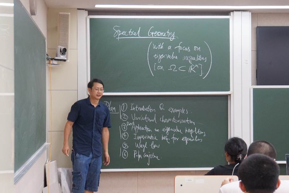 王作勤教授的课程是“谱几何”,他介绍了欧氏空间中有界区域上拉普拉斯算子的特征值相关内容,包括迪利克雷和诺伊曼特征值的定义,区域单调性,特征值比较,外尔法则,波利亚猜想等。