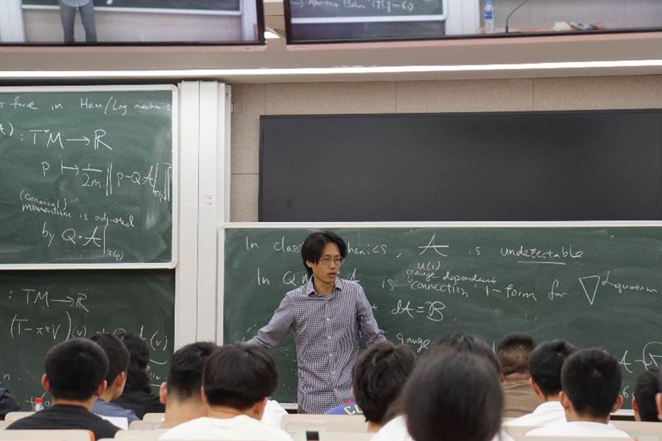程国传助理教授讲授的短课程是“几何与物理”,从量子力学和规范原理的角度介绍了纤维丛和联络等几何中的重要概念,让同学们了解了这些数学概念的物理背景。