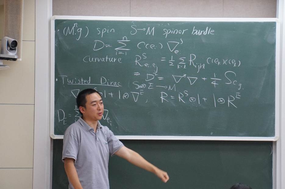 王晋民助理教授的课程名称是“Dirac算子和正数量曲率”,数量曲率是近年来黎曼几何中非常热门的研究课题,而Dirac算子是研究数量曲率的一个重要工具。王教授介绍了利用Dirac算子的方法证明Llarull的球面数量曲率刚性定理,以及最近的一些数量曲率刚性定理。