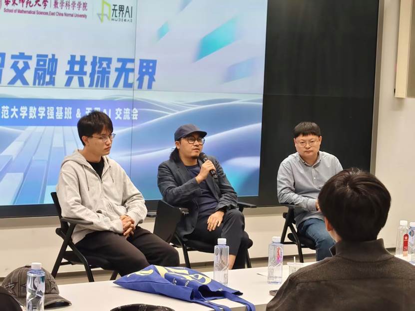 圆桌交流讨论环节,CTO张飞彪、算法总监邹国平、算法工程师陈佳雷分别结合个人成长经历,与同学们展开面对面交流。同学们围绕“数学专业进入AI领域的准备”“互联网企业招聘需求”“大学期间的学习重点”等话题踊跃提问,企业代表逐一作出耐心细致的回答。