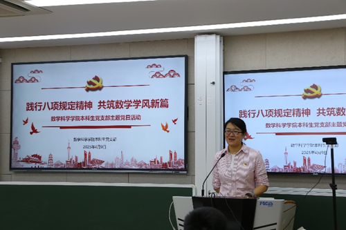 党建领学风,知行育良才——数学科学学院本科生党支部开展主题党日活动2025年4月9日,数学科学学院本科生党支部 “践行八项规定精神,共筑数学学风新篇”主题党日活动在学院401报告厅举行。学院党委挂职副书记郭静出席活动,支部全体党员同志、本科生入党积极分子及各年级学生代表参会。...2025-04-09