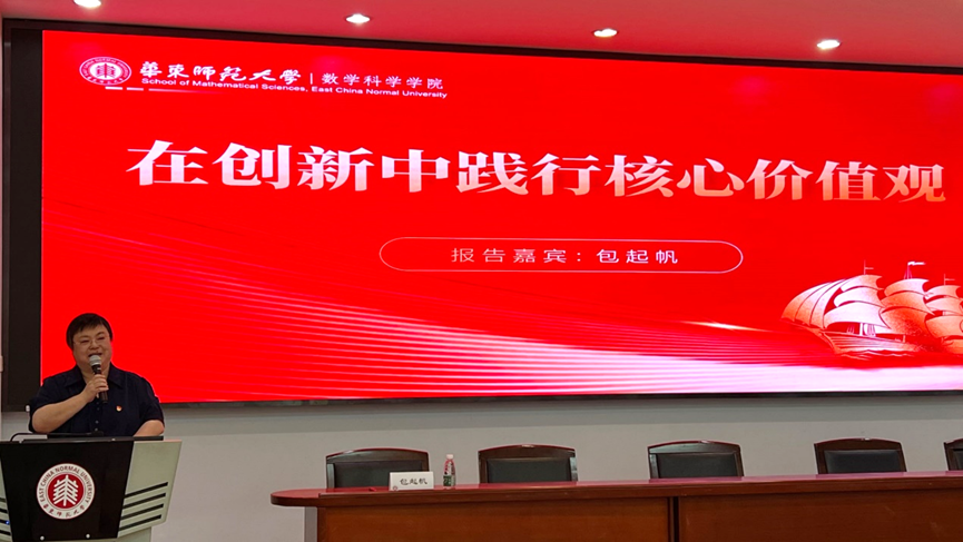 6月12日下午,数学科学学院举行集中学习教育,邀请华东师范大学国际航运物流研究院院长、上海工匠学院院长、上海劳模学院院长包起帆作“在创新中践行核心价值观”专题报告。报告会由学院党委书记贾挚主持,学院全体师生党员聆听了报告。